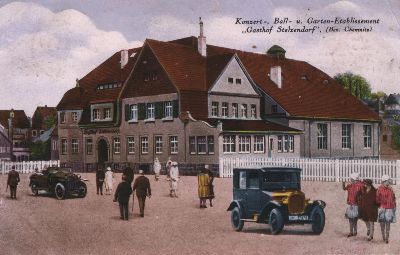 Der bisherige Gasthof, welcher sich am Standort der heutigen freiwilligen Feuerwehr Stelzendorf befand, wurde durch einen Brand im Jahre 1908 völlig zerstört. Auf der 'grünen Wiese' lies der Bruder meines Urgroßvaters Carl Emil Uhlmann 1912 bei Chemnitz diesen im 'Heimatstil neu erbauten Gasthof Stelzendorf' errichten. Er bewohnte und bewirtschaftete den Gasthof als Besitzer für einige Jahre bis ca.1923. Der Gasthof verfügte über einen großen Saal, Vereins-Gast-und Billardzimmer mit Veranda im alten deutschen Stil. Desweiteren befand sich im Komplex die überregional modernste und vollautomatische Kegelbahn!!! Nach schwierigen Kriegs- und DDR Zeiten schloß der Gasthof schließlich nach der Wende 1990 für immer seine Pforten und das 'Sporthaus Mantel' pachtet seitdem den Gebäudekomplex als Verkaufseinrichtung.