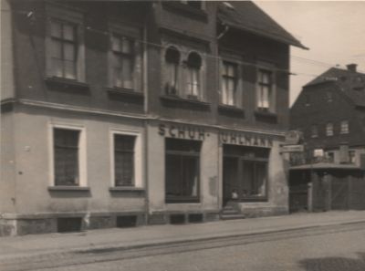 Die Linie nachfolgend von Max Arno Uhlmann ist dem Schuh-macherhandwerk über mehrere Generationen gefolgt. Hier links im Bild eines der Schuhgeschäfte mit Reparatur-werkstatt in Siegmar.