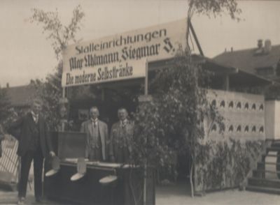 Der Messestand einer Land-wirtschaft-austellung (ca.1924). In der Mitte der Senior der Firma Max Hugo und links der damalige Junior mein Großvater Max Herbert.
